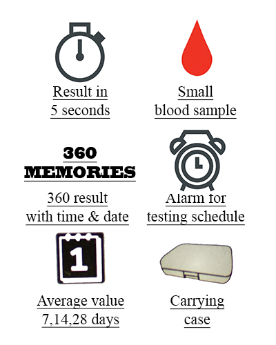 • Function : Screen display, 360 memories, glucose oxidase biosensor method,